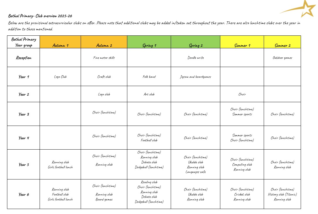 At our school, we know that learning doesn’t stop at the classroom door. Our extra-curricular clubs give children the chance to explore new interests, develop important life skills, and build confidence while having fun with their friends. From inclusive sports and music to art and computing, there’s something for everyone to enjoy. The clubs we offer may change throughout the year, depending on children’s interests and the availability of staff and providers. If you have any links to local organisations or outside agencies that might be interested in running a club with us, please let the school office know, we are always looking to add exciting new opportunities for pupils.